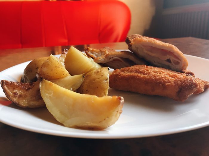 | 150 g | Bravčový rezeň Černohor, opekané zemiaky (1,3,7) | 8,50 € |